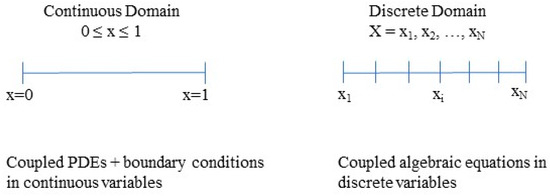 CFD replaces the continuous problem domain with a discrete domain using a grid. Thus, numerical methods are used to convert these partial differential governing equations to a coupled algebraic set of equations. Typically, the governing partial differential equations of fluid mechanics are first discretized into algebraic equations using specialist numerical techniques/methods such as Finite Differences, Finite Elements, Finite Volumes, Lattice Boltzmann, Smoothed Particle Hydrodynamics, etc. Specialist matrix solvers which can be both iterative (i.e., Conjugate Gradient) or direct (Multi-Frontal) are then used to solve this algebraic system of equations. Each variable is defined at every point in the continuous domain, while in the discrete domain, each variable is defined only at the grid points, as in Figure 1. CFD directly solves for flow variables only at the grid points, but interpolation techniques are used for values between the grid points. The discrete variables become a large system of coupled algebraic equations that involves iterative calculations amenable for computer computation. The reader can view many introductory writings on CFD found elsewhere [7,8,9,10,11,12,13,14]. Solving CFD problems involves three major steps that include (i) preprocessing (creation of geometry and meshing), (ii) solving the governing equations over this meshed model, and (iii) post-processing results to be analyzed. An example is defined at every point in the continuous domain converted into a discrete domain.