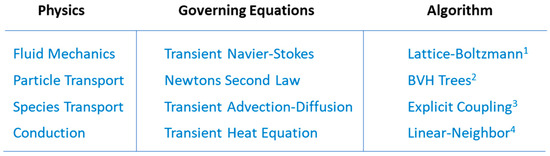 and is used to generate temperatures for the scenario being investigated. Each term in the continuity, momentum, and energy equation (e.g., Equations (1)–(3)) can be found in any elementary treatise on the subject (Bird, Stewart, Lightfoot, 1960 [15]). All three governing equations are numerically solved to generate solutions using CFD. There are many opensource (free) CFD packages, such as OpenFOAM, SU2, Palabos, Fire Dynamics Simulator, and MFIX (OpenFOAM is most popular with users, with a tutorial, extended code, and programmers guide), along with many commercial packages users can utilize. A major advantage of commercial CFD packages is the ease of use via graphical user interfaces for pre- and post-processing, which reduces the hurdle associated with learning the package. CFD code became common during the 1950s–1970s. Computers necessary to run such code cost ~USD 10 million (2024 dollars) and key players were the Los Alamos National Lab, Douglas Aircraft, and NASA, with code written to model specific (not generic) examples. Off-the-shelf commercial code become available during the 1980s–2010s, and many examples of this work used the commercial CFD package COMSOL Multiphysics (https://www.comsol.com, accessed on 11 August 2024), but other packages exist, such as ANSYS FLUENT (https://www.ansys.com, accessed on 11 August 2024), STAR-CCM+ (https://plm.sw.siemens.com/en-US/, accessed on 11 August 2024), Altair (https://www.altair.com/altair-cfd, accessed on 11 August 2024), etc. These codes are designed to run on CPUs and often require extensive training and project time (weeks/months) and computers to run this software, costing ~USD 1–10 million (in 2024 dollars). More recently, GBU execution has evolved (2010s–present) and can be orders of magnitude faster than CPU code via software such as MstarCFD (https://mstarcfd.com accessed on 11 August 2024), Palabos (University of Geneva, https://palabos.unige.ch/publications/ accessed on 11 August 2024), and LB-2D (Harvard University, Randles and Kaxiras 2014 [16]). Project time is now measured in hours or days using computers costing ~USD $2000 (in 2024 dollars). Examples of various GBU algorithms are found in Figure 2.