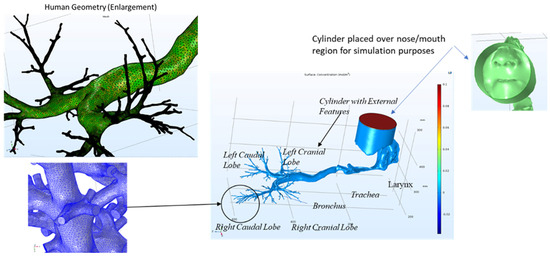 References for three dimensional CFD modeling for inhaled material transport are found elsewhere [17,18,19,20]. The following provides an example of the use of CFD for 1,3-D, which was undertaken about the time the product was returned to Dow when Corteva was formed. It is based upon an award-winning paper by Corley et al., 2012 [21] (Pacific Northwest National Lab). These researchers investigated the inhalation of a volatile material when smoking cigarettes. Files used by Corley et al., 2012 [21] were converted from OpenFoam (a freeware CFD package) to COMSOL Multiphysics. Now, we assume that a former Corteva product (1,3-dichloropropene) resulting from agricultural use was inhaled instead of cigarette smoke. COMSOL was used for human and rat inhalation scenarios; see Figure 3 and Figure 4. This analysis bypassed the need for lower tier (and higher safety factor) approaches and allowed Corteva to assess the risk directly associated with inhaled vapor of 1,3-dichloropropene. Computed tomography (CAT) scans for a human and rat (corpses) were used, with a cylinder placed around the mouth/nose for CFD input; see Figure 3. The assigned breathing rates for a typical human and rat were used, partition coefficients and physicochemical properties for 1,3-D, etc., were assumed, and the determination of where 1,3-D was absorbed in the body was determined. The regional uptakes of 1,3-D in the human respiratory track were sensitive to air concentration levels, airflow rates, air-tissue partition coefficients, tissue thickness, and metabolism rates and occurred early in the process, well before reaching the lung. CFD predictions of 1,3-D exposure and uptake to humans via the inhalation exposure route eliminated the simplistic back-of-the-envelope exposure approaches (with safety factors) often used to estimate dose and exposures for inhalation gas dosimetry, while providing a key scientific approach for the inhalation dosimetry of gasses. It was found that 1,3-D is absorbed rapidly early in the breathing process (e.g., in the trachea) and does not reach deep into the lungs when predicted losses of 1,3-D from the soil (vapor phase) are anticipated; see Figure 4. Computational Fluid Dynamics eliminates the need for lower-tier (and higher safety factor) approaches to allow the ability to predict risk associated with inhaled vapor and aerosol exposures of organic chemicals.