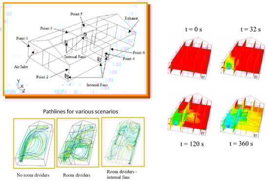 Home aeration following pest fumigation (e.g., when can a resident safely reenter a treated structure?) Graphic on the right gives 2D slices in the 3D simulation domain as the home is aerated with fresh air.