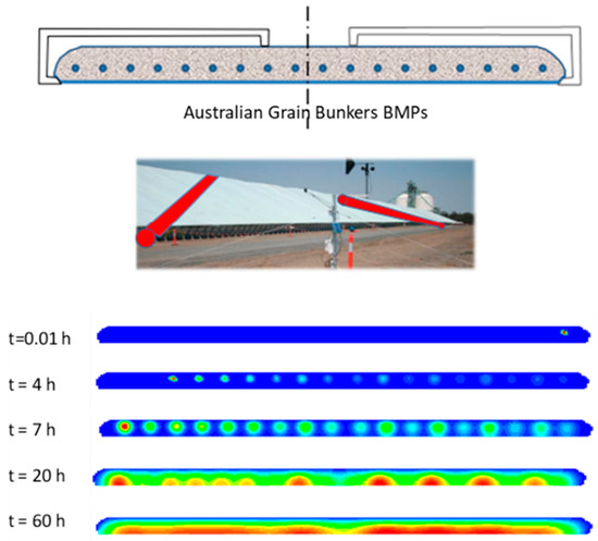 An Australian grain bunker treated with sulfuryl fluoride to control insect pests, where CFD was used to simulate the amount, location, and duration (e.g., best management practices (BMP)) for the pesticide such that efficacy estimates could be made.