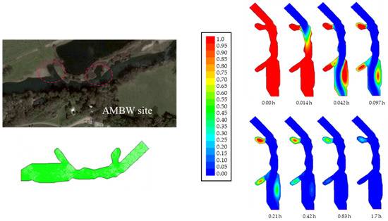 Drift loading to stream and backwater regions: 2D geometry of the stream section was discretized by hand, where backwater regions are clearly seen. Graphic on the right is the transient stream mass fraction following a chemical insult predicted by CFD.