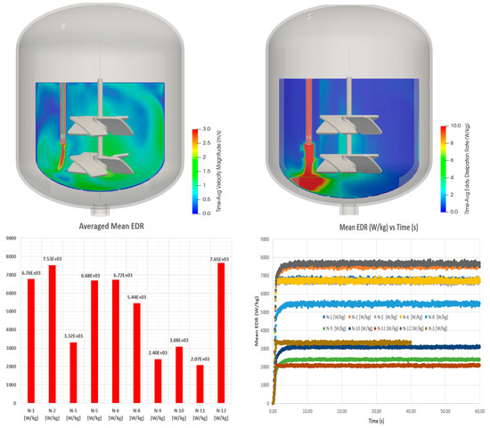 Our present computational methodology to model, simulate, and understand mixing-based multi-physics processes within Corteva includes using a Lattice Boltzmann LES framework on GPU architecture [32,33,34]. This strategy inherently alleviates the limitations posed by Reynolds Averaged Navier–Stokes (RANS)-equation-based approaches by resolving the transients in fluid flow, turbulence, and additional physics associated with scalar species transport, gas–solid, gas–liquid mass transfer, liquid–liquid immiscible interactions, non-Newtonian rheology, bubble coalescence/break-up, bubble/particle motion tracking, and rotating impeller/shaft geometries within the stirred tank reactor vessels or continuous flow reactor systems.