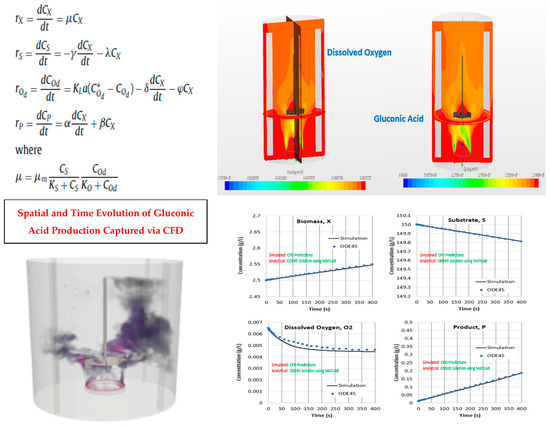 Finally, we highlight an approach to integrate the unstructured biochemical reaction kinetics with our existing Lattice Boltzmann-based CFD modeling framework (Hanspal et al., 2023 [32], Hanspal et al. [33], Hanspal and Thomas [34], Yeoh et al., 2004, 2005 [35,36], Sirasitthichoke et al., 2022 [37]). This case study involves the application of a Euler–Lagrange CFD approach for the simulation of gluconic acid production based on Contois chemical kinetics published in the literature. Sample results illustrate the time evolution of species concentrations, including glucose, dissolved oxygen, gluconic acid, and biomass, which have been simulated using CFD and compared against the ordinary differential equation (ODE)-based solution implemented in MATLAB (R2020a). Illustrated in Figure 21 are the spatially varying heterogeneous distributions of gluconic acid in the system that can result in an overall yield loss for the fermentation process.