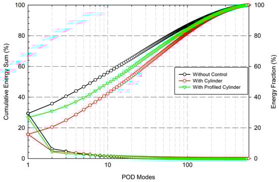 - Snapshot POD analysis indicates that in the absence of control, and with control using a profiled cylinder, the first POD mode contains nearly 30% of the flow’s KE, while only 15% of the KE is contained in the first POD mode when using the standard cylinder. This aligns with the decreased vorticity distribution in the shear layer of the flow controlled with the cylinder, resulting in weakened vortical structures. Consequently, the POD projection attributes less energy to the first POD modes since they are associated with these coherent structures.