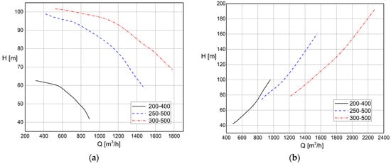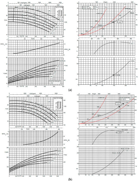 Some of the KSB norm pumps tested experimentally: (a) Etanorm 150-315/334 and (b) Etanorm 250-500/520 operating in pump (n = 1450 rpm) and in turbine mode (n = 1520 rpm and n = 1000 rpm).