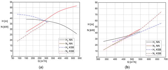 NN 150-315 and KSB 150-315 curves in (a) pump and (b) turbine regime (n = 1520 rpm).