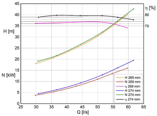 The pipeline is 1304 m long and has an internal diameter of 592 mm, which corresponds to an HDPE pipeline with a nominal pressure of 4 bar. The gross head of the turbine is 36 m, while the installed flow rate is 0.48 m3/s. A PAT aggregate was installed at this location, i.e., a pump manufactured by Grundfos, whose purpose is to maintain production and to use the available potential during periods of low water when the turbine cannot operate. One aggregate with two different impellers (diameters 269 mm and 274 mm) was tested at the facility; one is NK 100-250/269, while the other is NK 100-250/274 (Figure 6). For the impeller diameters 269 mm and 274 mm, the maximum relative difference in the value of turbine head and power is up to 5% and 6%, respectively, and for efficiency up to 10%.
