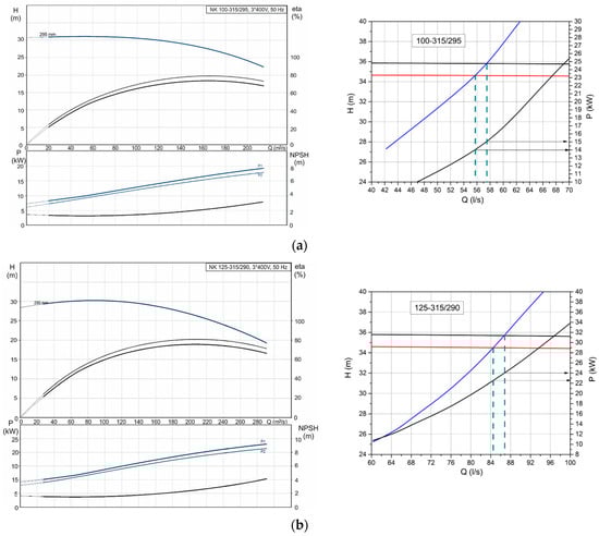 Some of the Grundfos norm pumps tested experimentally: (a) NK 100-315/295 and (b) NK 125-315/290 operating in pump (n = 1470 rpm) and in turbine mode (n = 1520 rpm).