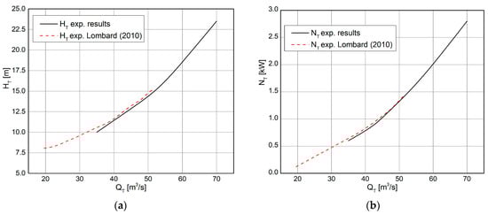 Comparison of (a) turbine head and (b) turbine power for Etanorm 50-160, n = 1520 rpm with the results obtained by Lombard [].