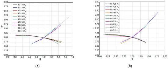 Dimensionless head curves of pump and turbine mode: (a) Etanorm 40, (b) Etanorm 65.