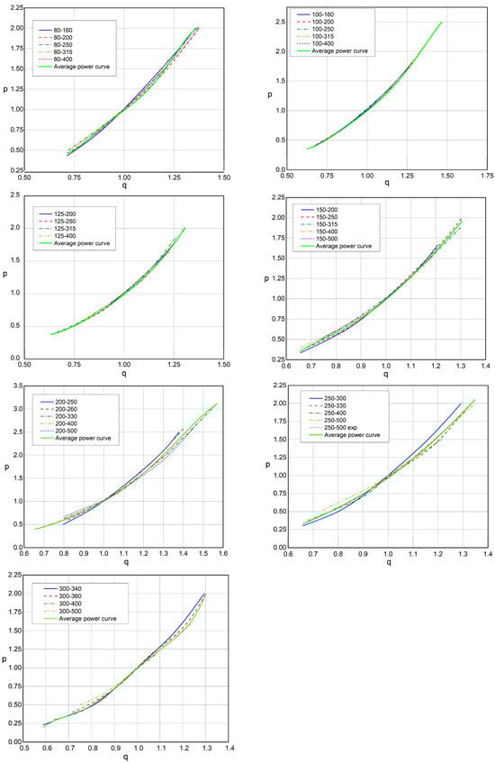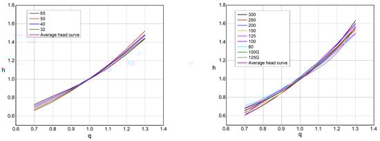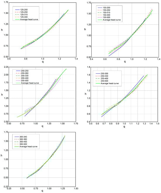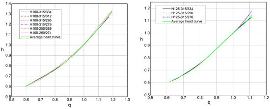 All performance curves are given as dimensionless, to compare different PAT sizes and present the universal performance curve. Dimensionless head curves are given in Figure 10, Figure 11 and Figure 12, while dimensionless power curves are given in Figure 13 and Figure 14.