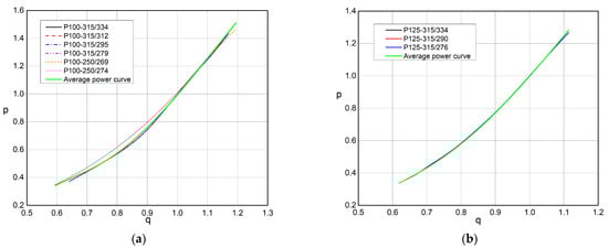 Dimensionless power curves of PAT: (a) Grundfos 100 and (b) Grundfos 125.