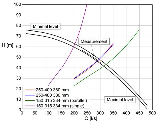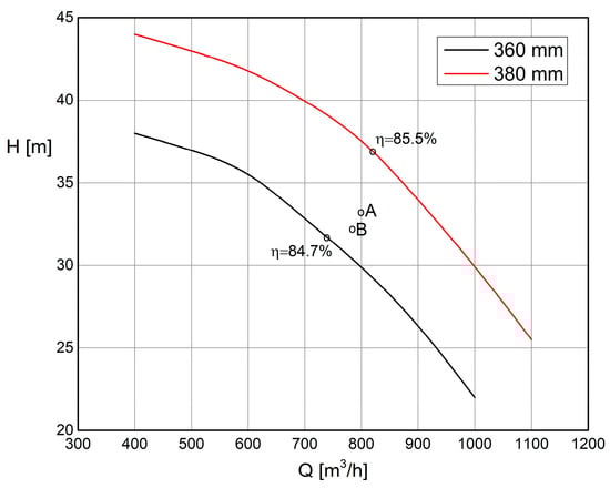 The optimal operating point for the impeller diameter of 334 mm is Hbep,p = 32 m and Qbep,p = 120.0 L/s, while for the defined flow rate 110 L/s, the aggregate operates with a head of 33 m and an efficiency of around 86% (Figure 20 point C).