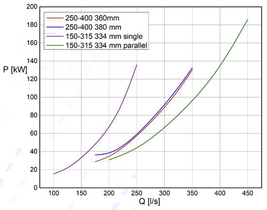 Calculated power curves for different PAT solutions (250-400 and 150-315).