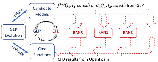 To address this limitation, this research uses an innovative framework known as CFD-driven training, where the fitness or effectiveness of proposed models is directly assessed through RANS calculations [32,33]. This approach builds upon the gene expression programming (GEP) method [34]. However, instead of relying on an algebraic function for assessment, it performs RANS calculations, potentially offering a more integrative and comprehensive evaluation of the model’s capabilities. This method’s flexibility in defining the cost function is a notable distinction from other data-driven approaches. Rather than limiting the fitness evaluation to match Reynolds stresses with high-fidelity data, this method allows for any flow feature from the CFD results to define the cost function. This adaptability is invaluable, particularly when access to extensive training data is restricted.