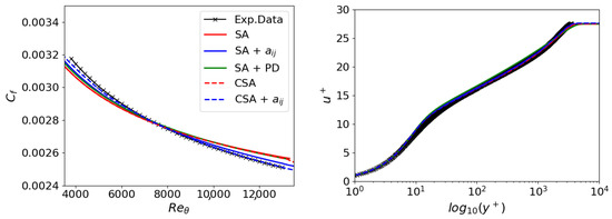 Since the SA + PD models do not improve upon the original SA model, optimizing the original SA model’s coefficients for the flat plate test case is impossible. Indeed, they have been optimized for this case. Contrarily, the inclusion of SA + notably enhances prediction, particularly in the downstream region of the flat plate. However, this adjustment does not yield significant improvements in the upstream section. Therefore, a new formulation of the one-equation turbulence model is needed, and the CSA model proves helpful. Its original version is stable and consistent with the SA model, but simultaneously, it allows for more accurate optimization through GEP. This capability should be attributed to the fact that optimizing the anisotropy of Reynolds stresses also impacts the production term. In essence, a kind of double optimization with a single extension is possible.