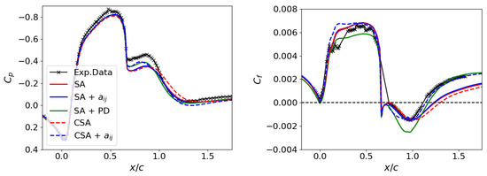 Figure 5 and Figure 6 display the juxtaposition of numerical results with experimental data from Seifert et al. [54] for the hump case. The pressure and friction coefficients along the hump’s surface are illustrated in Figure 5. The reattachment point, and consequently, the size of the separation bubble, is identified where . Significant discrepancies manifest proximal to and succeeding the separation bubble. The SA model generally underestimates both coefficients post-bubble, similar to the deviation for the flat plate in Section 3.1. The distinction lies in the magnitude of the friction coefficient discrepancies for the hump, which are more pronounced than those for the flat plate.