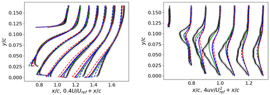 ASJ: Velocity profiles on the left and Reynolds stress profiles on the right (refer to Figure 10 for the legend).