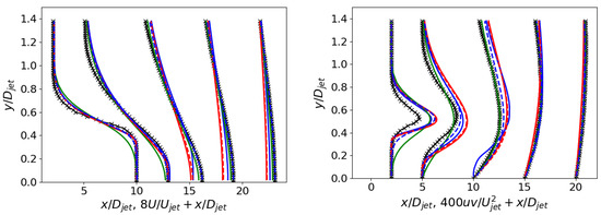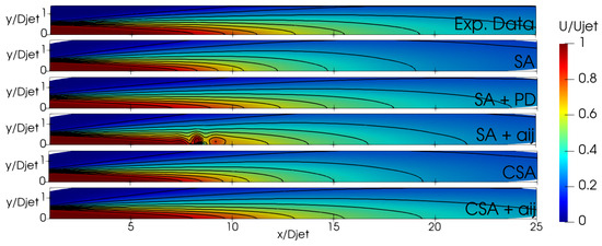 Figure 10 and Figure 11 show the jet case’s velocity and shear stress profiles along the jet axis and at various locations. Both models, CSA + and SA + PD, exhibit comparable performance, curtailing diffusion and refining the mean flow and second-moment profiles. Considering the shear stress profiles, while the advancements are not as pronounced as observed in the velocity profiles, they are impressive, given that RANS primarily centers on mean flow parameters. Instead, the SA + model is numerically unstable and presents only marginal enhancements, even in this flow case.