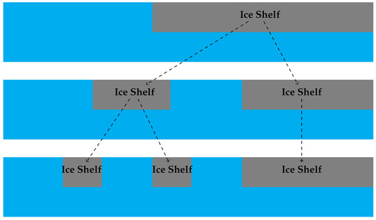 Several authors have sought to model ice shelf breakup. Sergienko et al. [19] developed a thin elastic plate model based on the shallow water approximation. They determined the vibrational modes of this interconnected system by employing a thin-plate approximation for the ice shelf and considering the potential water flow within the ice shelf cavity. They found that long ocean waves and shorter sea swell waves affect ice shelves, and can cause iceberg calving and disintegration under certain circumstances. England et al. [24] presented a model to predict iceberg fracture based on the “footloose mechanism”, which is a natural process in which icebergs rapidly become isolated in open water with surface temperatures significantly above freezing. Their model, which they parametrised using data from the Antarctic Iceberg Tracking Database, gave more accurate predictions of the survival times of large Antarctic icebergs than existing models. In addition to the aforementioned works, there is a relative scarcity of mathematical models exploring ice shelf breakup dynamics. However, several mathematical models have examined the related problem of ocean wave-induced breakup of sea ice. Mokus and Montiel [25] proposed a numerical model to predict the pattern of sea ice breakup. In their model, breakup occurs in a successive manner, meaning that it occurs in a sequence of instantaneous breakup events, each occurring in a single location. This method enables a granular examination of the breakup process. However, a significant limitation of their study is that they only considered time-harmonic vibrations. In this paper, we develop and solve a mathematical model of time-dependent shallow water wave interaction with a partially fragmented semi-infinite ice shelf. Our reason for developing this model is so that we can later include it in a sequential ice shelf breakup model, which is analogous to the sequential sea ice breakup model considered by Mokus and Montiel [25] except that we will consider the problem in the time domain. Figure 1 shows a schematic describing the sequential breakup of ice shelves.