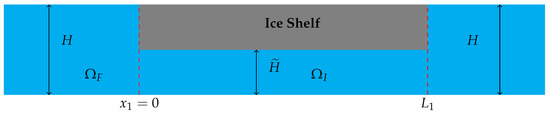 The motion of the ocean–ice shelf system is determined by the displacement and the velocity potential of the fluid . In particular, describes the vertical displacement of the free surface of the fluid for , and the vertical displacement of the ice for . As a consequence of shallow water wave theory and Euler–Bernoulli beam theory, and U satisfy the following coupled system of partial differential equations.