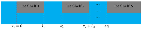 where , and and are the sets of left and right endpoints of the ice shelves, respectively. For example, if , then and . Note that (2b) and (2c) take different forms at the left and right endpoints of the ice shelves, whereas the other matching conditions do not.