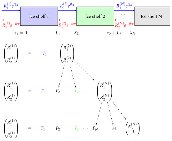 We apply the transfer matrix method to solve the multiple scattering problem of ice shelf fragments in front of a semi-infinite ice shelf, as illustrated in Figure 4. The transfer matrix method is briefly outlined here through the use of a diagram in Figure 5. Full details are given in [29,30]. The general solution to the multiple scattering problem is of the form