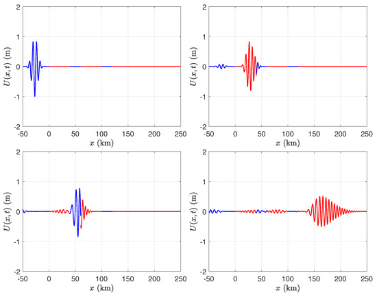 Time-dependent displacement of the water wave–ice shelf system due to an incident Gaussian wave packet. The blue line segments indicate the displacement of the free surface of the water, while the red line segments indicate the vertical displacement of the ice, with a thickness of m and a same length of 40 km and 20 km water gaps, showing how the ice shelves respond to wave forces.