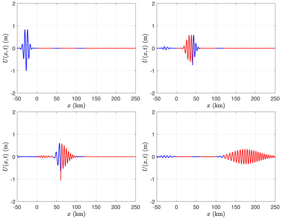 We consider the case of two broken ice shelves, each of length 40 km, in front of a semi-infinite ice shelf. Both of the gaps between the ice shelves are of length 20 km. We evaluated the solution in the time domain using several values of ice shelf thickness, namely m, m, m, and m. We chose the parameters of the incident Gaussian wave packet to be m−1 and , and fixed the depth of the water to be m. Figure 6, Figure 7, Figure 8 and Figure 9 illustrate that, although there is not a significant change in wavelength as the wave packet enters the ice shelf, there can be a significant change in amplitude when the ice shelf is thick.