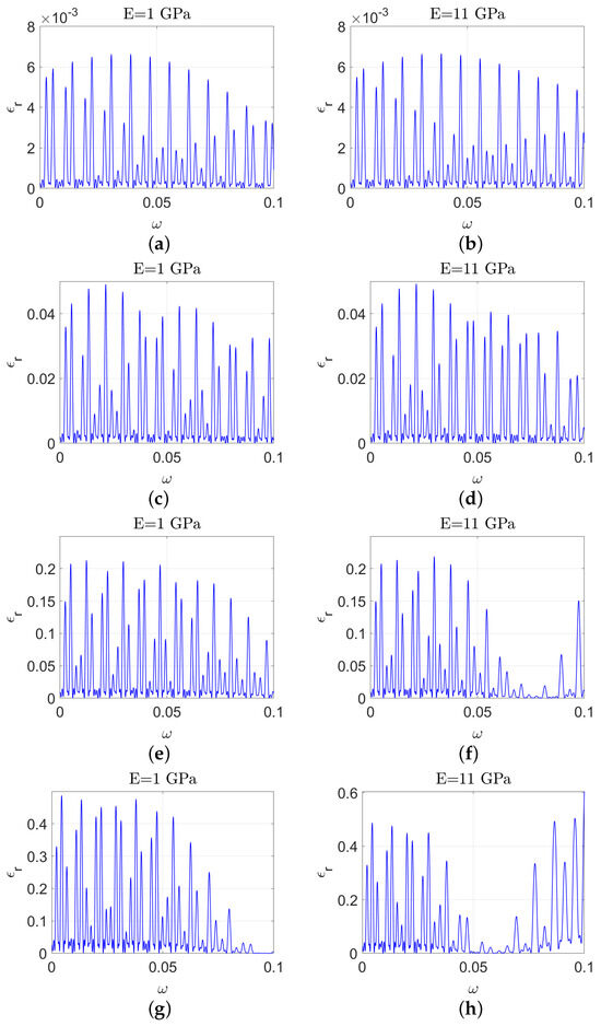 The propagation of water waves over ice shelves of varying thicknesses is illustrated as follows. Panels (a,b) show the reflected energy for a thin ice shelf with a thickness of (). Panels (c,d) depict the reflected energy for a moderately thick ice shelf with a thickness of (). Panels (e,f) present the reflected energy for a significantly thicker ice shelf with a thickness of (). Panels (g,h) illustrate the reflected energy for a very thick ice shelf with a thickness of (). The figures on the left have a lower value for Young’s modulus compared to those on the right, as shown in the figure title.