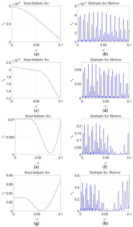 The propagation of water waves over ice shelves of varying thicknesses is illustrated as follows. Panels (a,b) show the reflected energy for a thin ice shelf with a thickness of (). Panels (c,d) depict the reflected energy for a moderately thick ice shelf with a thickness of (). Panels (e,f) present the reflected energy for a significantly thicker ice shelf with a thickness of (). Panels (g,h) illustrate the reflected energy for a very thick ice shelf with a thickness of (). Panels (a,c,g) show the reflected energy for multiple ice shelves, while Panels (b,d,f) represent the reflected energy for semi-infinite ice shelves.