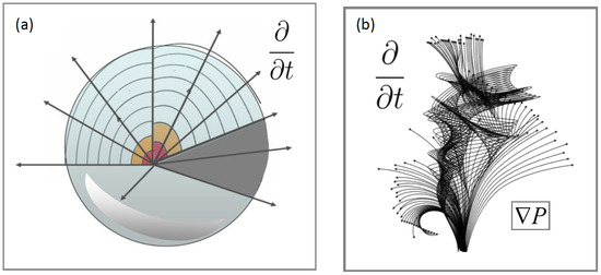 The first Del operator in Equation (8) takes the dot product or divergence of [MT−3], and denotes the pressure gradient. If normalized pressure is initiated at initial time, and gravity gradients are negligible, the spatial changes in are governed by Equation (8) as would apply to a perfectly homogenous, isotropic porous medium with slow, laminar flow due to the pressure gradient (Figure 2a).