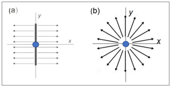 The resulting pressure gradient in the radial direction away from a wellbore placed in the origin (using a conjugate set of 1D planar sources as in Figure 5a,b), represented in a Cartesian grid for the resulting apparent 2D diffusion within the (x, y) plane, may be computed from [41]: