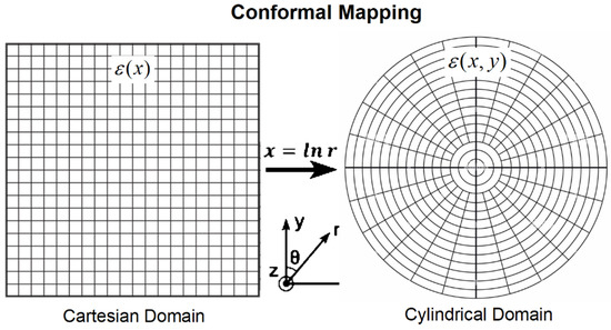 In order to correct for the divergence deficit, we apply a coordinate transformation of the 1D diffusion space to a 2D cylindrical diffusion space. The required transformation of the Cartesian reference system to a polar reference system can be achieved by conformal mapping (Figure 8), such that the normalized spatial coordinate x in domain ε(x) is mapped to lnr in the domain ε(x,y):