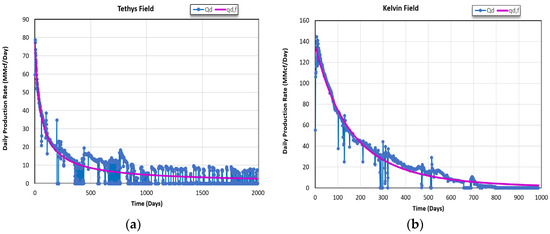 It is important to note that the inclusion of “+1” in the numerator of Equations (18) and (19) serves to accurately represent the wellbore as a point source at r = 0. However, in practical wellbore applications, the spatial distance between the wellbore and the boundary typically precludes the necessity of this correction. To plot Figure 6a,b, no inputs are required other than normalized pressure change at the wellbore location and assuming a unit diffusivity. In Section 5, we will show how the well rate declines as a consequence of the lowered bottomhole pressure for a production well case with a specific dimensional hydraulic diffusivity. Unlike classical well test analysis, the well rate is not a boundary condition but an output of the applied bottomhole pressure, original reservoir pressure and hydraulic diffusivity (and well radius, which is assumed to be negligible in Figure 6a,b). The dimensional example of well rate computation and production forecasting using real field data from the early well life is included in Section 5.4.