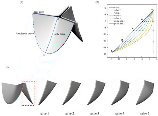 The diameter and height of the PHV determined the fixed coordinates of point A and point E on the valve surface and two guidelines were generated according to the coordinates of the two points. Point A located at the center of the free edge was traced to show the kinematics of the leaflets. On the premise of ensuring a smooth curve, according to the distance between two guide lines, the height of three additional points B, C and D on the guide line1 remained unchanged, they were moved 5.1 mm, 7.8 mm and 6.6 mm to the right, respectively, to obtain the control points of the belly curve for valve 1, and the new control points obtained in the previous step were moved to the right in the same manner four times to obtain the control points for valve 2, valve 3, valve 4 and valve 5. A third-order curve was used to connect five control points in sequence in Rhino 7.0 to generate the belly curve of each valve, as shown in Figure 1b. While maintaining the shape of the free edge of each valve, the free edge was swept along the belly curve to generate the surface of the leaflet, which was then intersected by the wall of the fluid domain. One leaflet was rotated around the vertical axis to create three identical leaflets to generate the final valve model. Side views of all models are shown in Figure 1c.