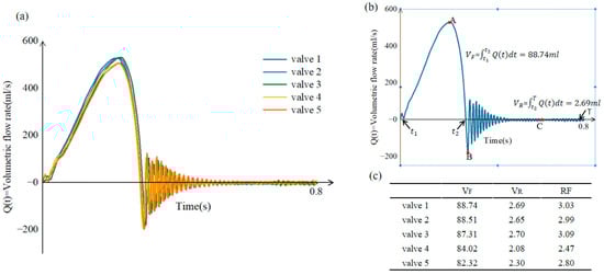 where VF is the volume of flow ejected through the test heart valve substitute during the forward flow period [,], and VR is the total volume of fluid through the valve per beat owing to the retrograde flow and is the sum of the closing volume (VC) and the leakage volume (VL) []. The calculation approaches and results of RF are summarized in Figure 4.
