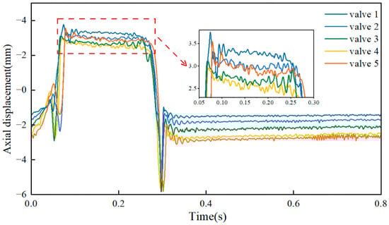 The axial displacement of point A increased as the valve opened, followed by a minor fluttering motion. During the period of fluttering, the axial displacement of point A decreased with the increase in the curvature of the belly curve, except for valve 5. After the valves were fully closed, the greater the curvature of belly curve, the larger the absolute value of the axial displacement of point A. In addition, the axial displacement waveform of point A of valve 5 showed obvious oscillation at the end of diastole.