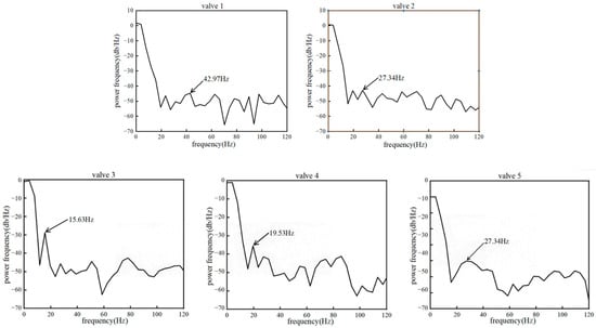 The waveforms of displacements in the inset of Figure 5 directly capture the fluttering dynamics of the valve during systole. The second highest peak in the power spectral density, calculated using MATLAB 2019a (MathWorks, Inc., Natick, MA, USA), was utilized to identify the dominant frequency characterizing leaflet fluttering []. As illustrated in Figure 6, the fluttering frequency of valve 1 (42.97 Hz) was notably higher than that of other valves. Valve 3 and valve 4 exhibited relatively lower fluttering frequencies (15.63 Hz and 19.53 Hz, respectively). With an increase in the curvature of the belly curve, valve 5 displayed higher fluttering frequencies (27.34 Hz).