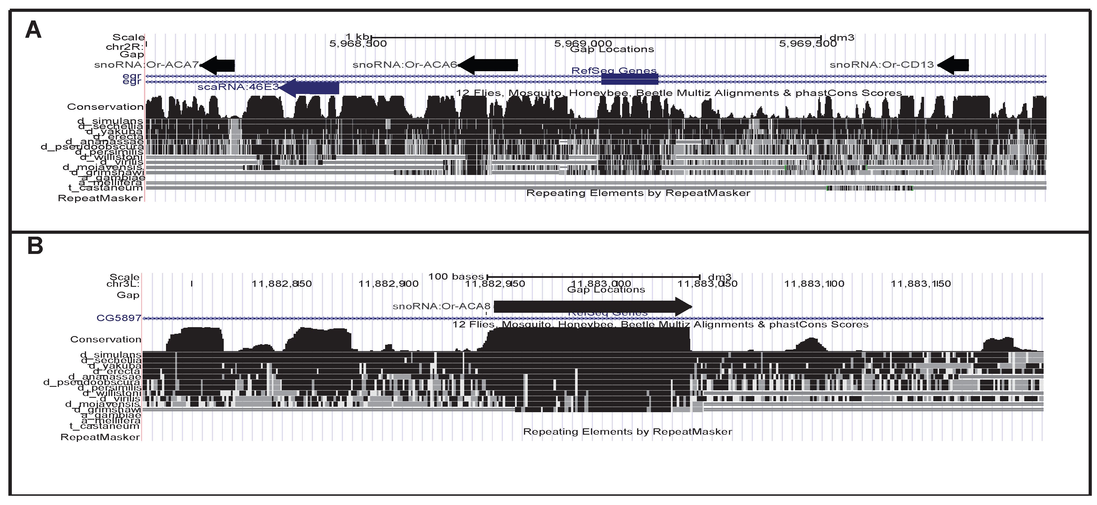 Two examples of novel snoRNAs. (A) Two box H/ACA and one box C/D snoRNAs were detected antisense to the eiger (egr) gene. Presumably, they derive from a common precursor with the scaRNA MeU1b-A234 (scaRNA:46E3); (B) Or-ACA8 is the best conserved among the novel snoRNAs, dating back at least to the ancestor of the Drosophila genus.