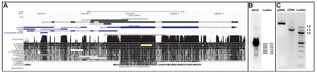 Genomic organization and expression strategy of Or-CD15. (A) Screen shot of the RpL23A/Uhg7 region taken from the UCSC genome browser. The RpL23A-RA and Uhg7 transcripts are depicted in blue, the location of Or-CD15 and the newly identified transcript RpL23A-RB are shown in black. Below, sequence conservation as measured by phastcons and the coverage of a multiple genome alignment is indicated; (B) Northern blot analysis of adult fruit fly RNA. The genomic position of the utilised probe is outlined in (A). The band at about 100 nt corresponds to snoRNA Or-CD15; sizes are indicated by an RNA molecular weight ladder (RiboRuler Low Range, Life Technologies); (C) PCR experiments using primers annealing to RpL23A exon 1 and Uhg7 exon 4; amplification of the genomic DNA (gDNA) produces the expected fragment of about 2 kb; the same primers used in RT-PCR experiments successfully amplified a fragment of 1.2 kb, representative of the new RpL23A-RB transcript. In this transcript, RpL23A and Uhg7 sequences are fused to each other. On the right, a DNA molecular weight ladder (100bp DNA ladder, New England BioLabs, Ipswich, MA, USA) is given.