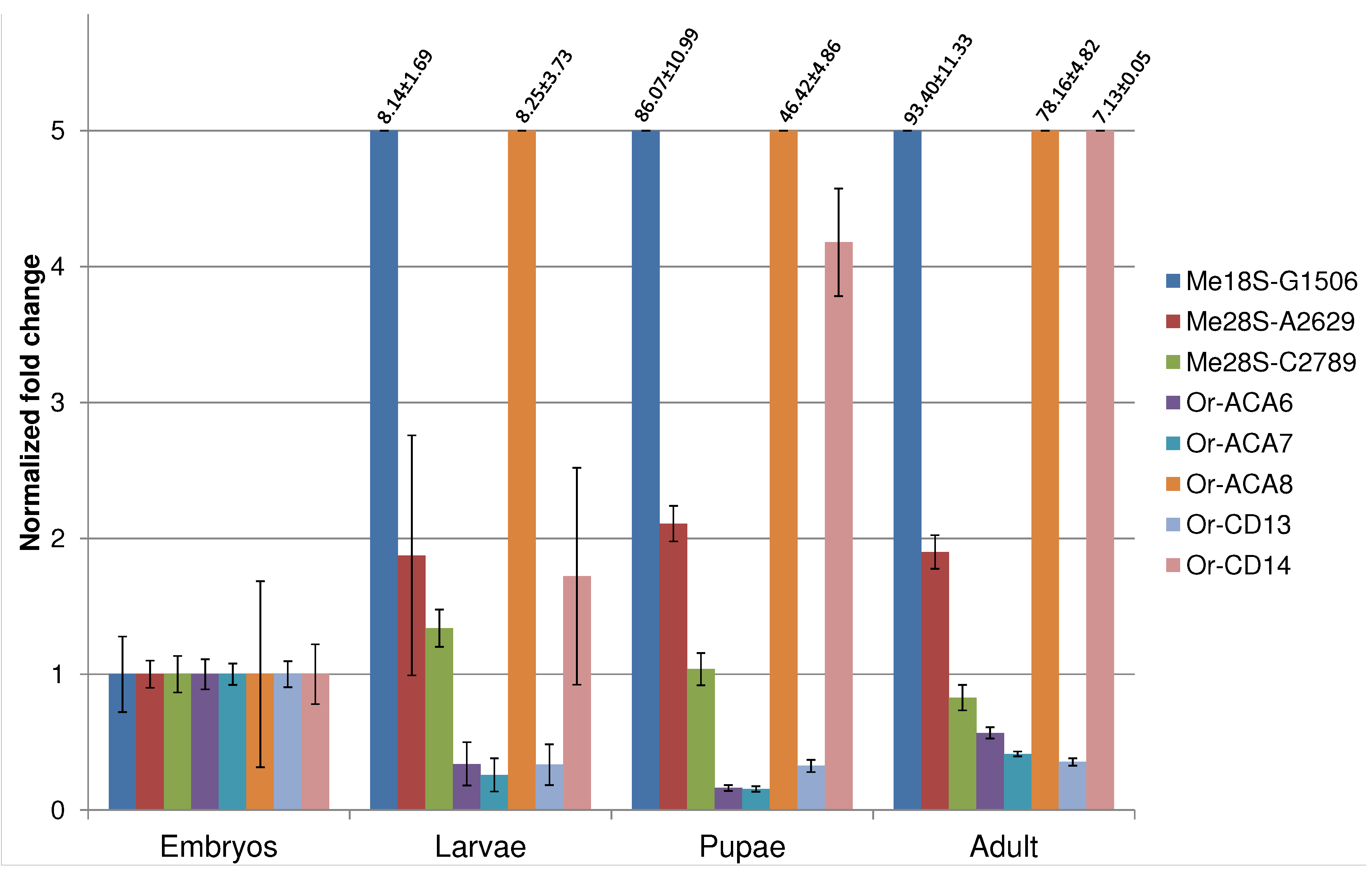 We evaluated the developmental expression profile of those eight newly identified snoRNAs by qRT-PCR that are within the expected size range for canonical snoRNAs and that do not overlap exons of other transcripts. To account for experimental errors, sex-related bias and stochastic fluctuation in expression profiles, we define a snoRNA as developmentally regulated if it shows a fold change of at least 2× relative to the embryo reference stage. According to this rule, and in agreement with previous data [10], only two of the assayed snoRNAs (Me28S-A2629 and Me28S-C2789) show a time course of expression that is not dependent on the developmental stage. All snoRNAs hosted in Uhg-46E3 (Or-ACA6, Or-ACA7, and Or-CD13) show a reduction of expression along the development. The remaining snoRNAs (Me18S-G1506, Or-ACA8 and Or-CD14) are all constantly up-regulated along development, reaching maximum expression at adult stage (see Figure 3). These data confirm the fine modulation of snoRNA expression.