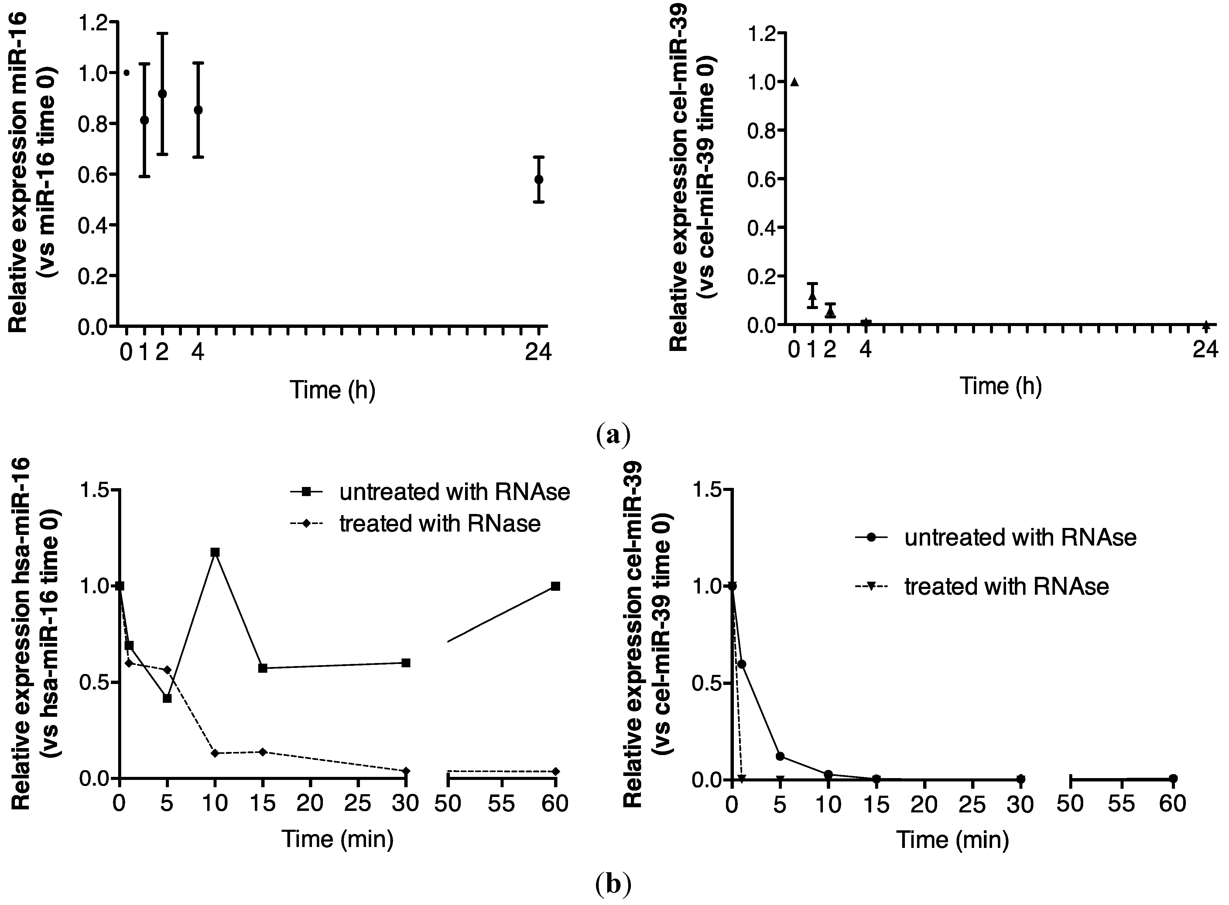 Endogenous urinary miR-16 was markedly more stable than exogenous cel-miR-39, suggesting stabilization by specific mechanisms.