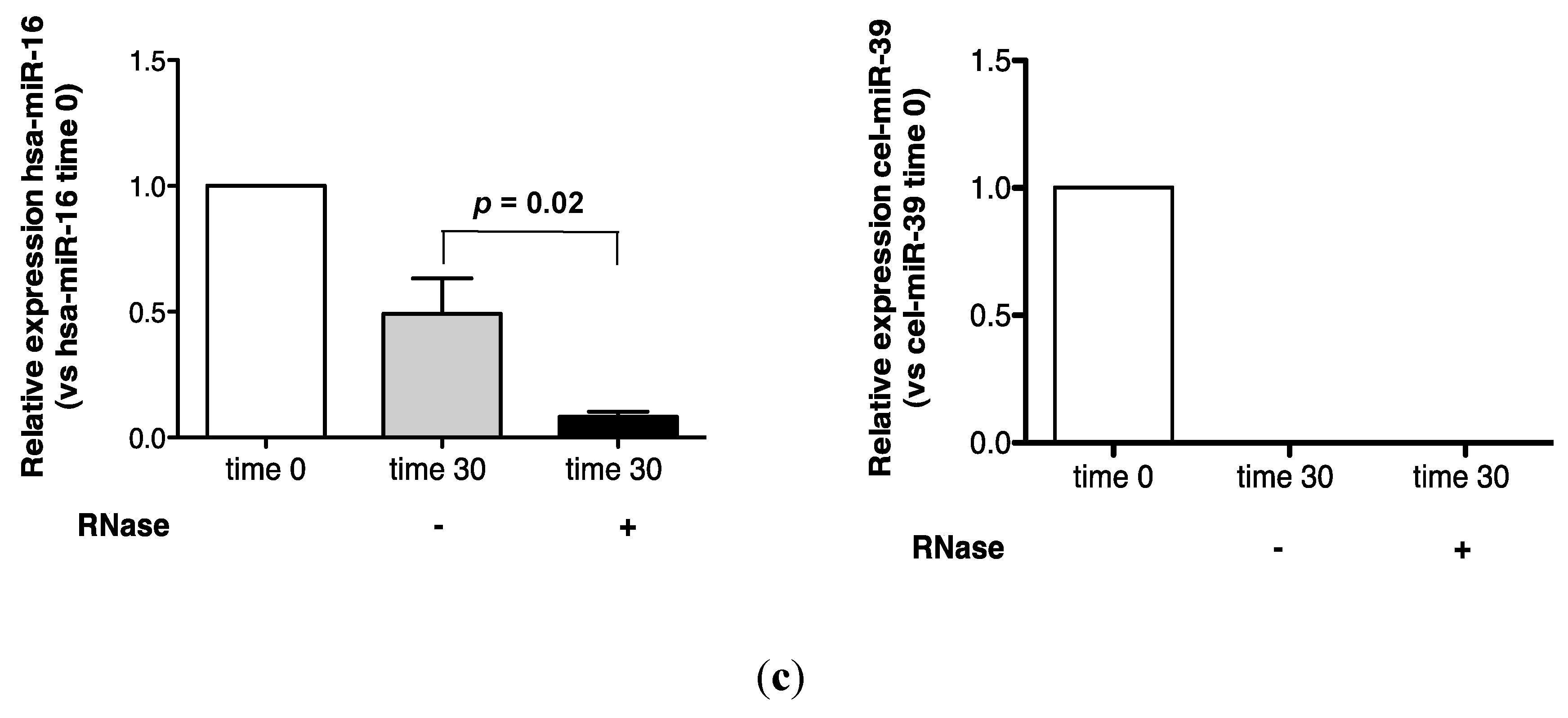 Urinary miR-16 recovery was stable over 1 h in the absence of RNase A, while cel-miR-39 was wholly degraded after 15 min (Figure 1b). In the presence of RNase A, approximately 15% of the time zero miR-16 signal was detected at 15 min, while no cel-miR-39 was detected after 1 min (Figure 1b). Significantly increased miR-16 sensitivity to 30 min of RNase A digestion was observed (p = 0.02, Figure 1c).