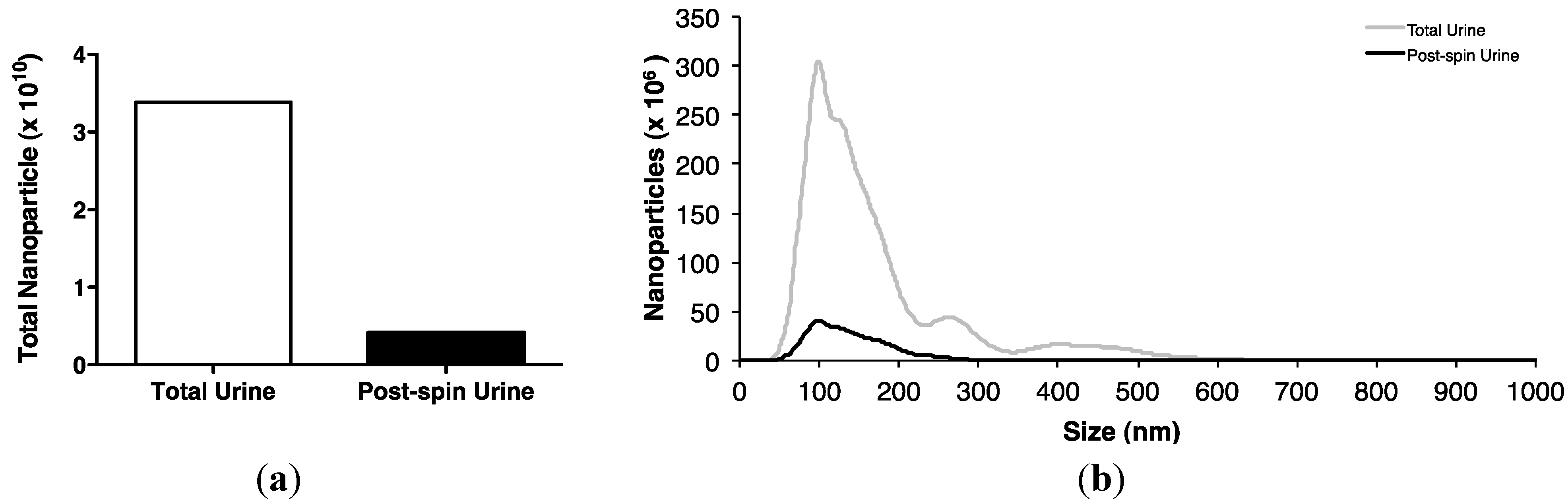 MiRNAs are present in exosomes: Spherical membrane-bound microvesicles of approximately 30–150 nm, purified from body fluids [15,16,17,23,25]. However, the contribution of this component to the total miRNA body fluid complement, and its functional significance, remain controversial [15,17,26,27]. Ultracentrifugation pelleted nearly 90% of urinary nanoparticles (Figure 2a), the majority of which were shown by nanoparticle tracking to be recovered between 70–200 nm, with the peak at 100 nm, central to the predicted size range typical of exosomes (Figure 2b).