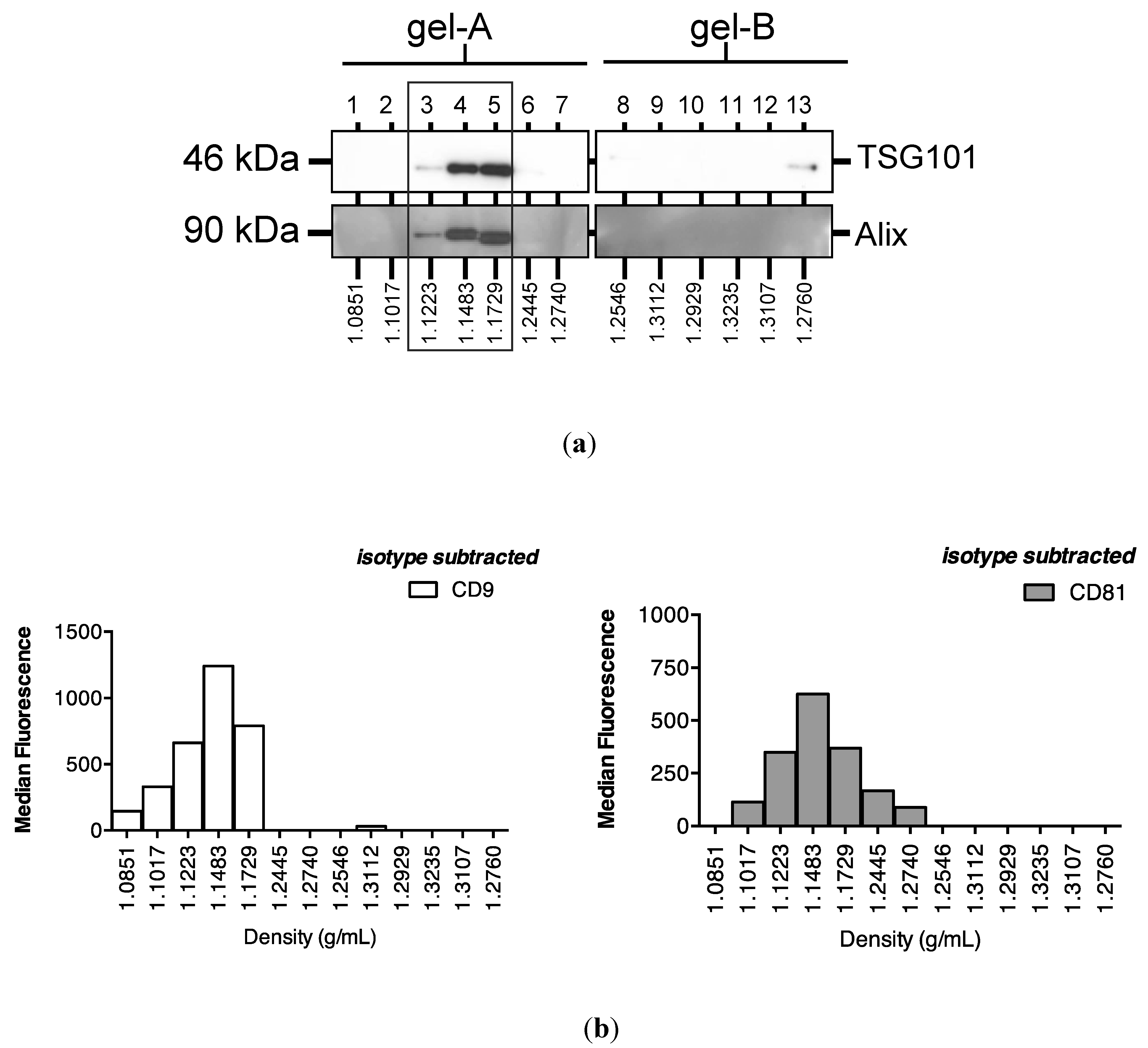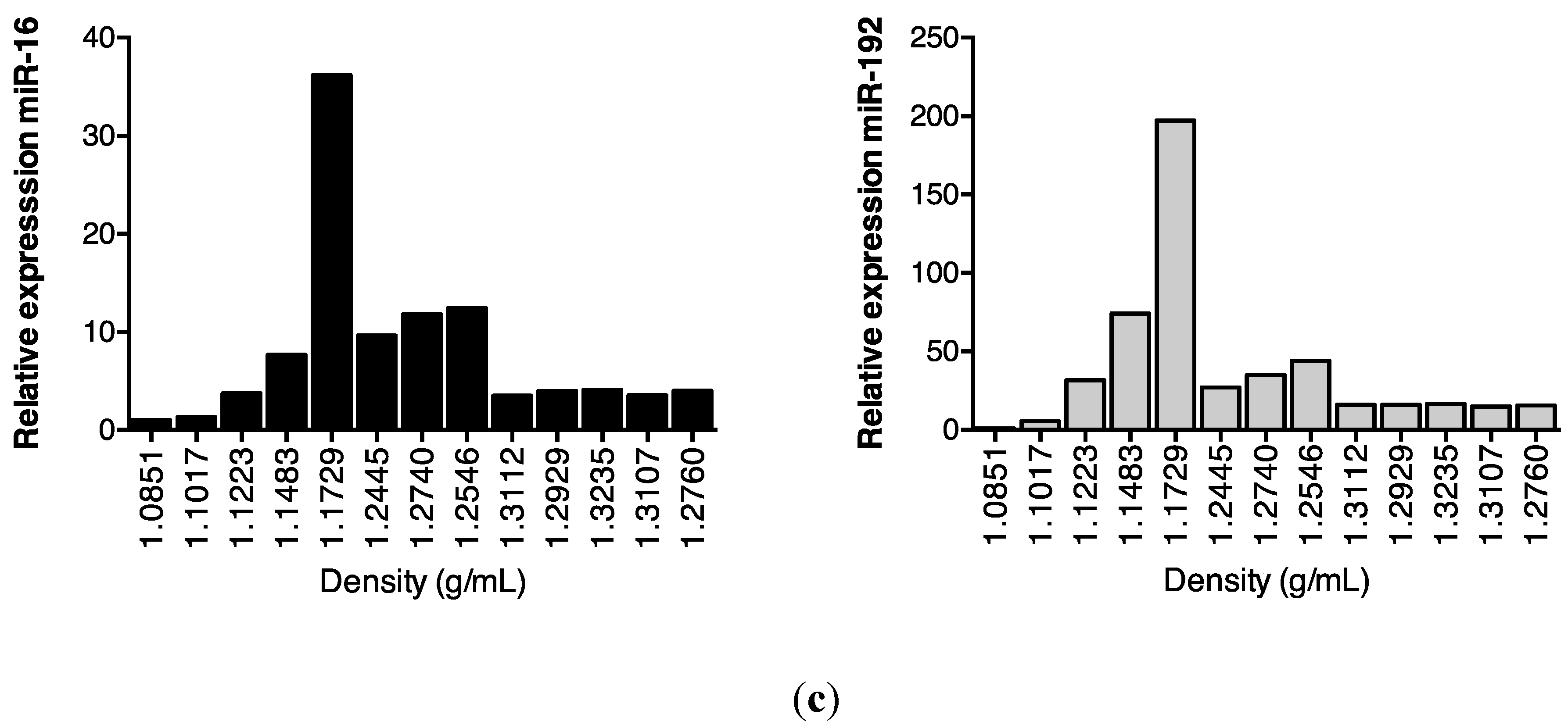 Subsequent sucrose gradient ultracentrifugation of the pellet isolated a series of sub-fractions, including those within the density range of 1.1–1.2 g/mL classically associated with exosomes [28]. These included fractions 3–5, in which Western analysis identified tumour susceptibility gene (TSG)101 and programmed cell death 6-interacting protein (Alix), markers of multivesicular bodies (Figure 3a). These fractions also contained an abundance of classical exosomally-expressed tetraspanins CD9 and CD81 (Figure 3b), as well as miR-16 and miR-192, both of which were consistent with exosomal association. However, Figure 3c also shows that miRNAs detected outside these exosome-enriched fractions, suggesting association of urinary miRNAs with other urinary extracellular microvesicles and/or pellet components.
