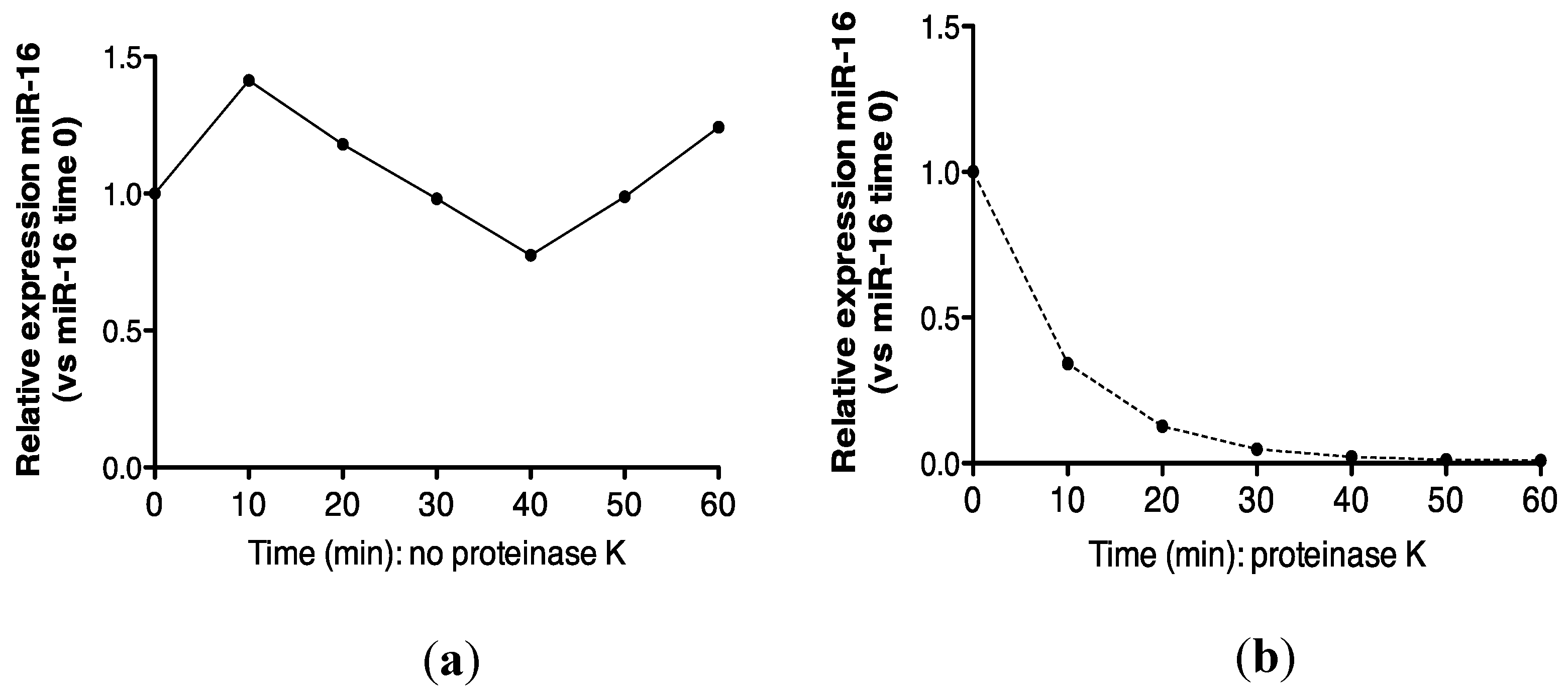 Previous data have demonstrated the sensitivity of plasma-borne miRNAs to proteinase K [15]. However, since extracellular vesicle-associated miRNAs are proteinase K resistant [29], we therefore investigated the effect of proteinase K digestion on urinary miRNA stability.