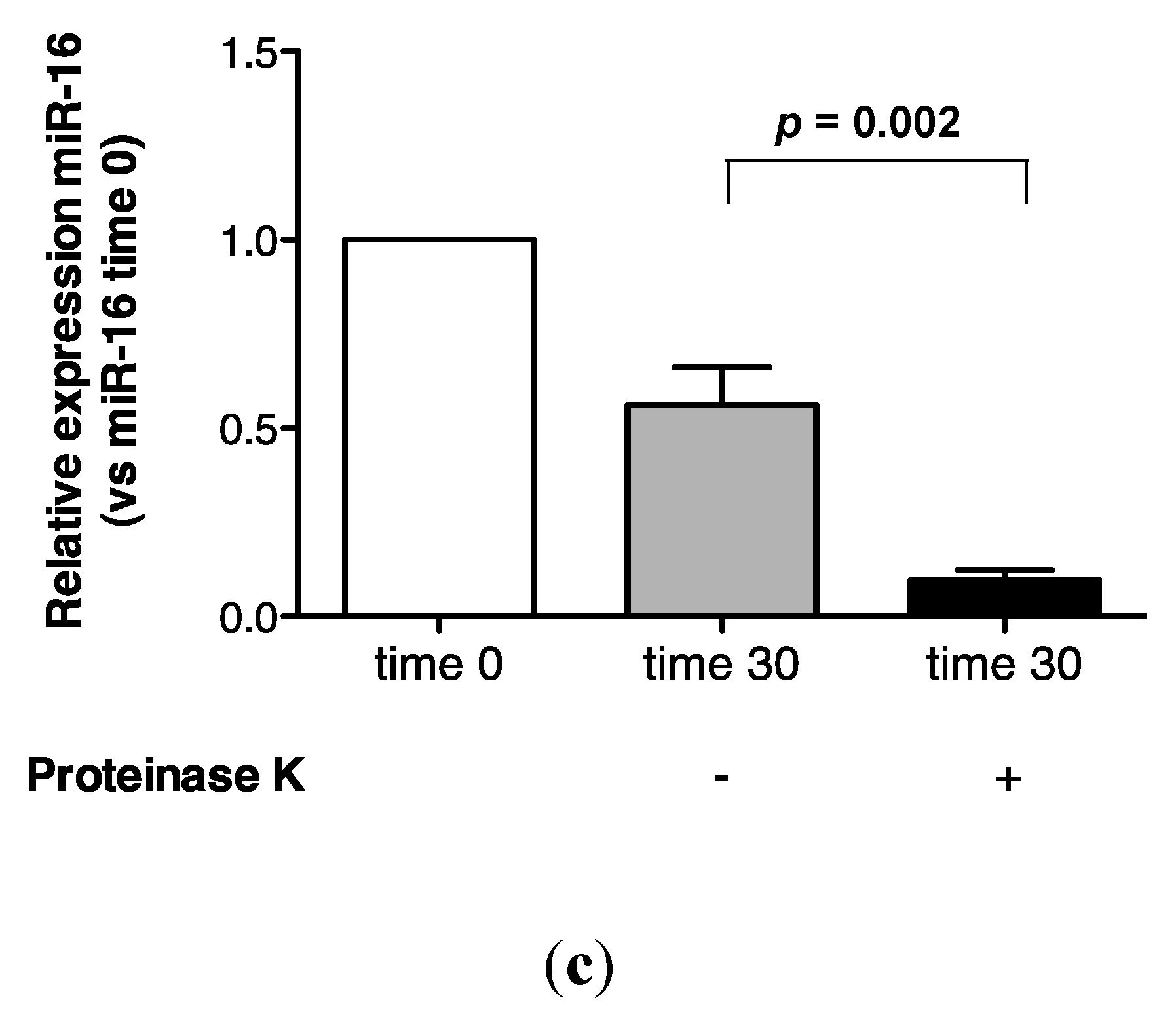 Recovery of miR-16 was compared in urine incubated at 55 °C alone, or in the presence of proteinase K. As shown (Figure 4a,b), approximately 100% recovery of miR-16 was obtained after 1 h at 55 °C, but this transcript was not detected following proteinase K digestion. Further analysis at the 30 min time-point showed that this effect was statistically significant (p = 0.002, Figure 4c).