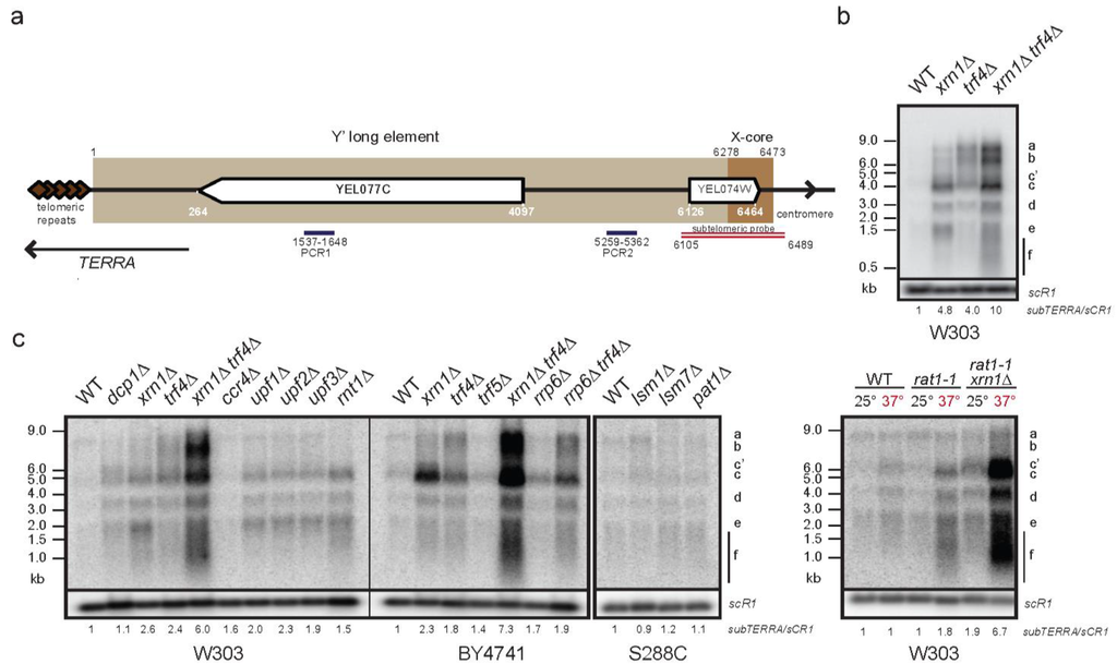 It is important to note that subtelomeric probes used for detection of subTERRA impose important limits; they allow detection of transcripts containing 384 nt-long sequence (Figure 1a) but cannot distinguish between RNAs transcribed towards telomeres or centromeres. Subtelomeric regions are difficult to analyze because of repeated character of their sequences. In order to detect subTERRA transcripts in a sense-specific manner we have tried numerous oligonucleotide probes covering the Y’-region but many of them showed cross-hybridization (non-specific signal) or no signal at all. To obtain insights into the orientation of subTERRA, we performed RT-qPCR using strand-specific primers (Figure S2b). This shows that subTERRA transcripts are produced by sense and antisense transcription both sensitive to Xrn1p and Trf4p RNA decay pathways to different extents. It should be also noted that the subTERRA steady-state level is sensitive to growth conditions, temperature and genetic backgrounds. We think that this is a common property of lncRNAs and quantification is only indicative for a tendency rather than an absolute value.